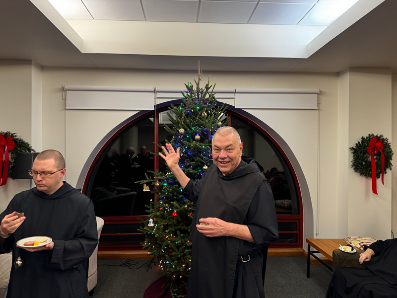 On December 23, 2025, the monastic community assembled in our calefactory (living room) for our annual tree trimming party. Brother Joel Blaize and his team of refectorians [Brother Jean and yours truly] set out a delicious spread of meats, cheeses, crackers, sweets, and drinks for the annual celebration. When asked about the soirée, Father Eugene Hensell was utterly speechless—this correspondent may have asked him for a comment right as he began enjoying a piece of cheese.