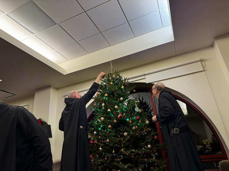 Several monks decorated the tree with ornaments. Our second youngest member, Brother Isaac Levering, had the honor of crowning the tree with its star. Not everyone took the opportunity to place an ornament on our Christmas tree, though all of us shared in fellowship with each other. Several of our expositi were home for Christmas—Father Warren Heitz, Father Edward Linton, Father Lorenzo Penalosa, and Father Nathaniel Szidik—and seized the chance to catch up with confreres and relish being home on the Hill.